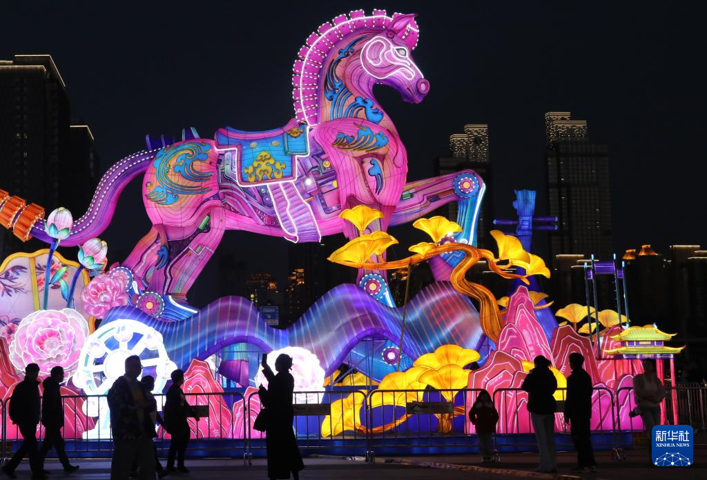 2月14日,游客在江苏苏州狮山文化广场赏灯游玩。