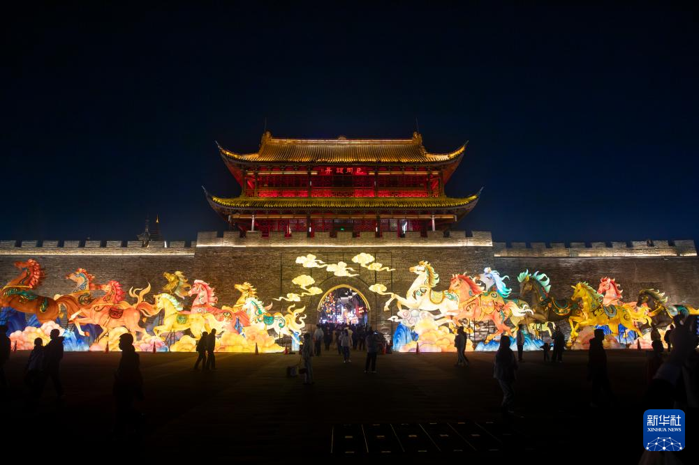 2月14日,市民和游客在湖北省襄阳古城观看 “千灯临汉 万户迎春”迎新春演出(无人机照片)。