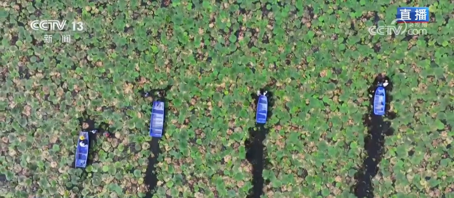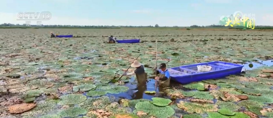 这个芡实种植基地总面积有4000多亩,以前是以种植小麦水稻为主。但是因为地处蒙洼蓄洪区,地势低洼,过去水患频发,容易积水,种植小麦水稻时时常受到涝害影响,产量不高。顺应自然规律,近年来,当地通过调整农业种植结构,大力发展适应性农业,因地制宜发展适合在低洼地种植的作物。比如说芡实,它是一种水生植物,营养价值高,市场需求旺盛。像记者现在所在的这个芡实种植基地,亩产可达600斤左右,每年亩均产值6000多元,而且采收期也带动村民的劳务收入显著增长,部分群众通过流转土地和务工实现人均年增收3万多元。变水患为水利,变对抗为适应,曾经被水患困扰的土地现在成了人们的“致富田”。