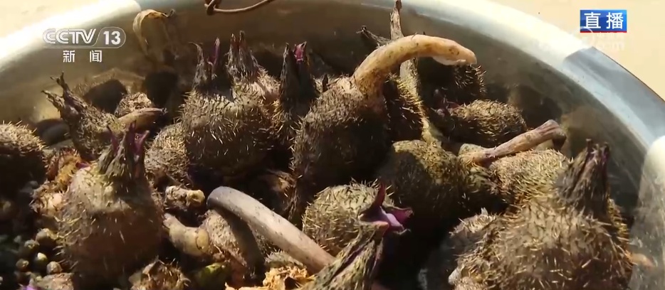 眼下,这里的芡实正陆续成熟,种植户们也开始了今年头茬芡实的采摘。在记者身旁的这片水塘里,可以看到村民们穿着雨裤站在水里,先用竹竿拨开浮在水面上的叶片,寻找藏在下面已经成熟的芡实果,找到之后再用刀尖在根茎上方用力一剜,拳头大的芡实果就采摘下来了,放到身旁的小船上。大家看记者手上刚采摘下来的芡实果,是不是很像鸡头,所以芡实也被叫做“鸡头米”。这里种植的芡实有两种,一种是像这样浑身长满尖刺的刺芡,用手摸上去感觉还是很硬的,所以在采摘的时候要戴上手套,当心被刺伤。另外一种是这样的是无刺芡实,学名叫“紫花苏芡”,又叫“光头强”,它的个头更大,表面光滑没有硬刺,采摘时比刺芡要容易一些。采摘下来的芡实果还要剥去外壳,取出其中的种子,才能得到常见的芡实。