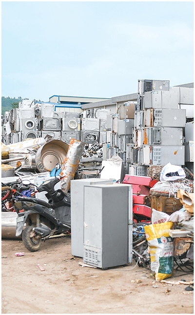 在广西壮族自治区柳州市一个废旧物品回收点,大量废旧冰箱、洗衣机等物品分门别类露天堆放在地上。新华社记者 曹祎铭 摄