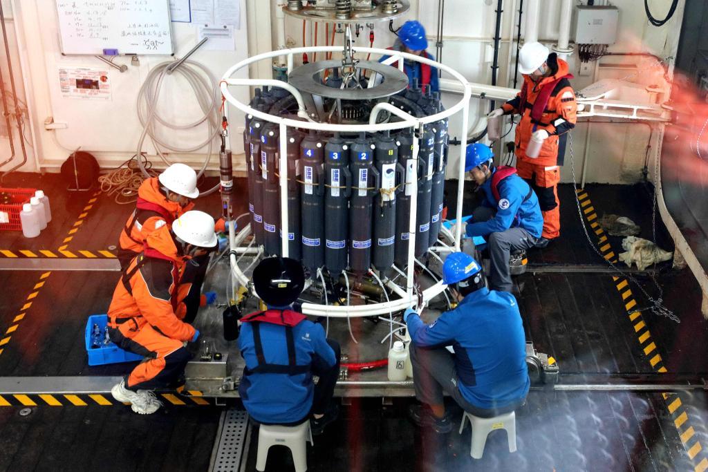 图为考察队员在“雪龙2”号舯甲板采集CTD带回的水样。新华社记者刘诗平 摄