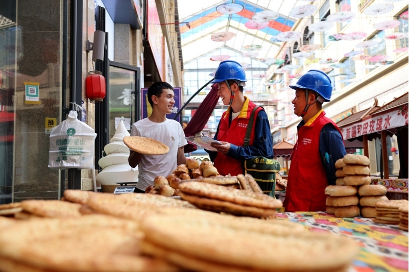 国家电网新疆电力(昌吉)天山雪莲共产党员服务队队员到昌馕产业文旅小镇了解用电需求。