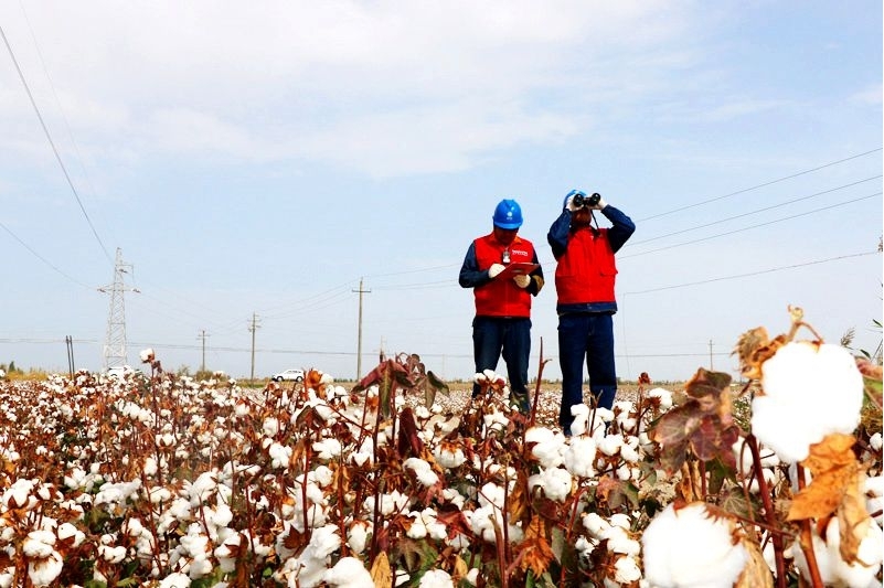 国家电网新疆电力(阿克苏)天山雪莲共产党员服务队开展棉田加工企业输电线路巡视。