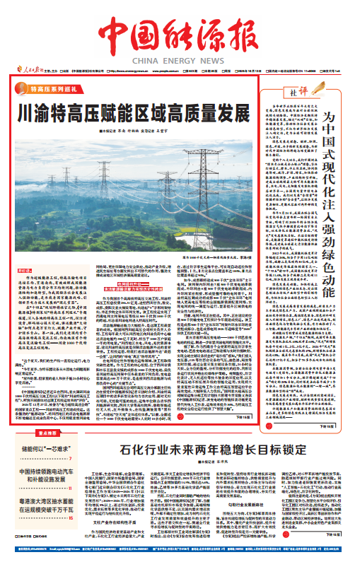 10月13日,《中国能源报》头版头条刊发“特高压系列巡礼”专题首篇报道《川渝特高压赋能区域高质量发展》,深度报道国家电网有限公司建成国内首个高海拔特高压交流工程——川渝1000千伏特高压交流工程,重塑川渝电网格局,将川西地区清洁电能输送至成渝负荷中心,更好保障电力安全供应、推动产业升级、增进民生福祉,有力支撑成渝地区双城经济圈高质量建设。