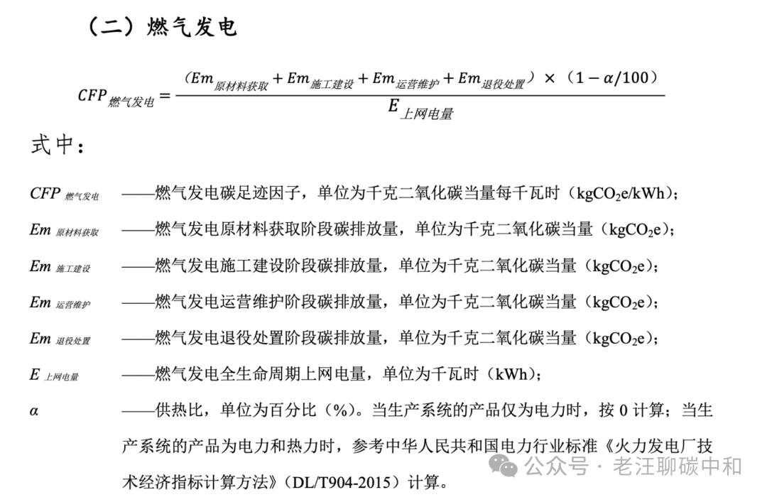 中国的电力碳足迹因子计算不是用传统的LCA分析法进行计算的,是介于LCA与项目碳核算之间的一种算法,我们可以称其为简化LCA算法。如燃气发电的电力碳足迹计算方法如下: