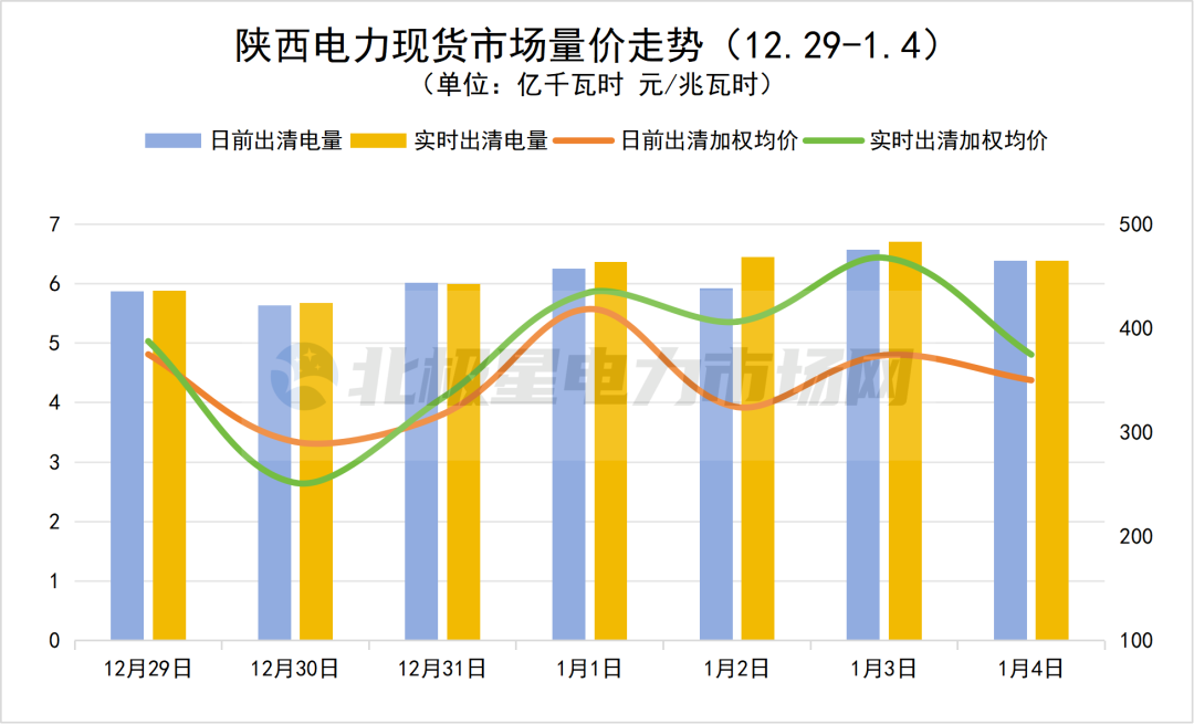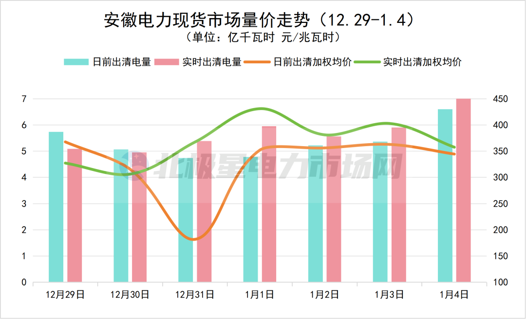 2025年12月29日至2026年1月4日日前出清加权均价最高为418.51元/兆瓦时,最低为290.98元/兆瓦时;日前出清加权均价最高为467.8元/兆瓦时,最低为251.58元/兆瓦时。