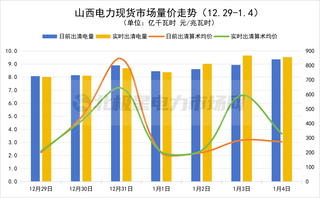 2025年12月29日至2026年1月4日日前出清算术均价最高为845.53元/兆瓦时,最低为197.1元/兆瓦时;实时出清算术均价最高为644.09元/兆瓦时,最低为203.52元/兆瓦时。