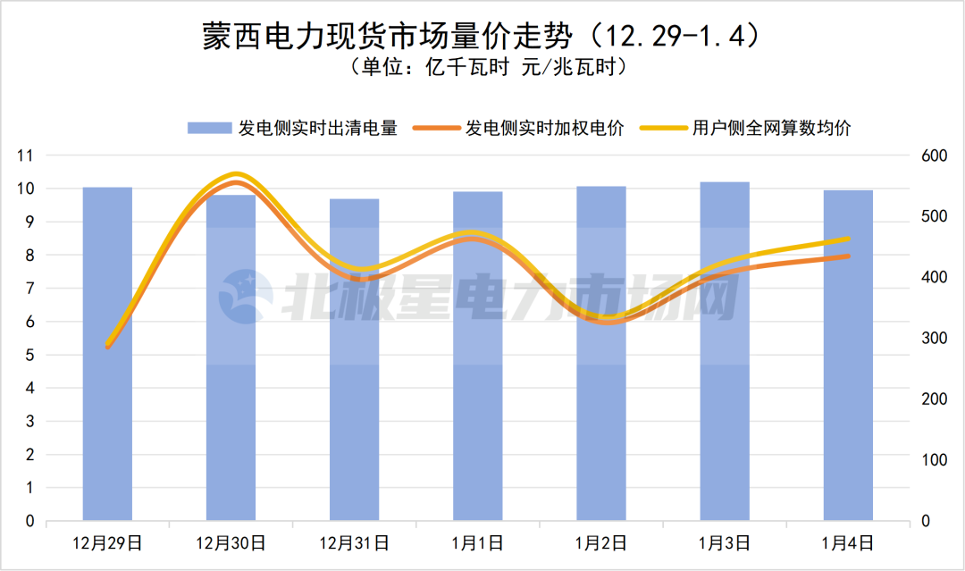 2025年12月29日至2026年1月4日日前发电侧均价最高为383.77厘/千瓦时,最低为176.51厘/千瓦时;实时发电侧均价最高为317.5厘/千瓦时,最低为112.71厘/千瓦时。