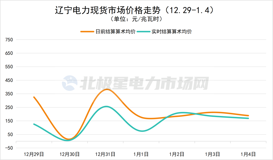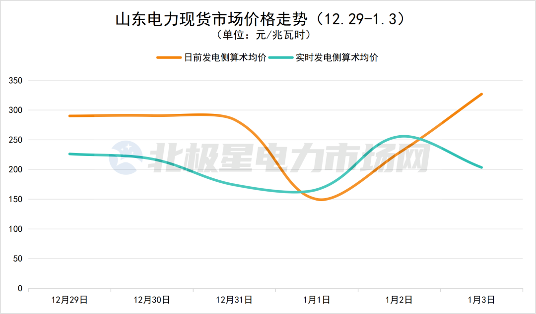 2025年12月29日至2026年1月3日日前发电侧算术均价最高为326.93元/兆瓦时,最低149.93元/兆瓦时;实时发电侧算术均价最高255.38元/兆瓦时,最低166.12元/兆瓦时。(1月4日暂未披露)