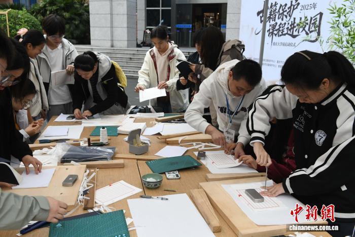 当天,古籍修复技艺体验活动在校内同步开展。重庆图书馆(重庆古籍保护中心)的古籍修复师们为重庆大学师生带来手抄经典、碑刻传拓、雕版印刷、线装书装订、古籍修复5项传统技艺体验。