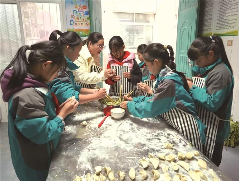 凤县新建路小学的劳动实践课上,老师教学生包饺子(资料照片)。
