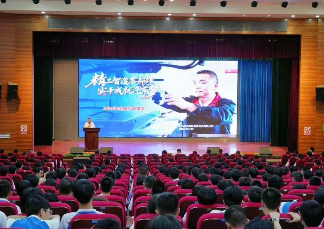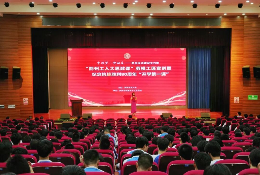 9月2日下午,由湖北省荆州市总工会主办的荆州“中国工人大思政课”劳模工匠宣讲走进荆州市机械电子工业学校,此次活动作为纪念中国人民抗日战争暨世界反法西斯战争胜利80周年的重要专场,以“开学第一课”的形式,为500名师生代表带来了一场深刻而生动的思想洗礼。