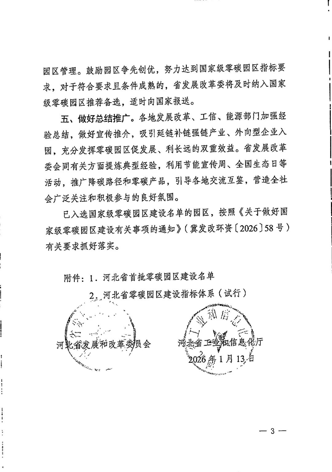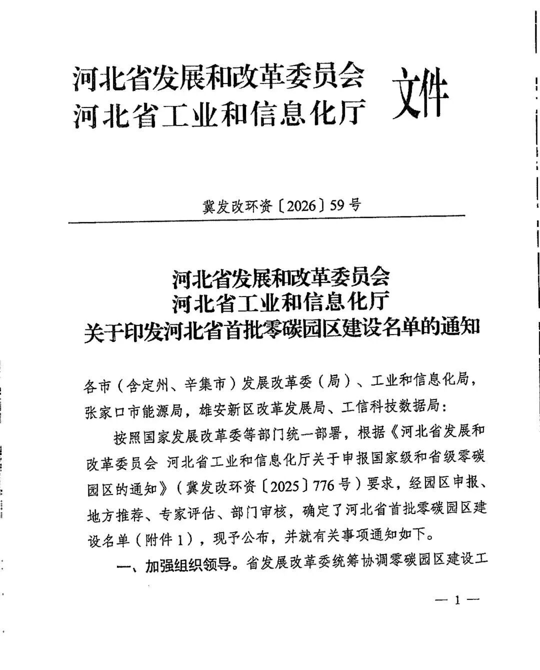 1月13日,河北省发展和改革委员会、河北省工业和信息化厅联合印发《关于印发河北省首批零碳园区建设名单的通知》冀发改环资[2026]59号文件。