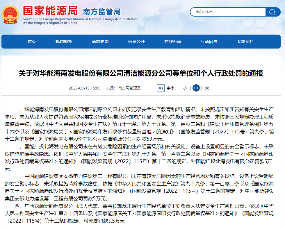 日前,国家能源局南方监管局发布关于对华能海南发电股份有限公司清洁能源分公司、国能广投北海发电有限公司、中国能源建设集团安徽电力建设第二工程有限公司以及广西龙源新能源有限公司等单位和个人行政处罚的通报。