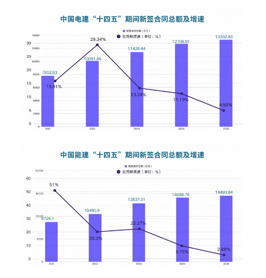 就在上周,中国电建、中国能建相继披露2025年新签合同额。中国电建全年新签合同总额达13332.83亿元,同比增长4.93%;中国能建全年新签合同额14493.84亿元,同比增长2.88%,两家企业均保持良好增长态势。