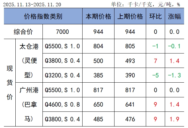 CECI进口指数到岸标煤单价944元/吨,环比持平。本期各煤种采购价格涨跌互现,其中太仓港(灵便型)3800千卡/千克价格环比上涨7元/吨,广州港(巴拿马型)4600千卡/千克价格环比上涨9元/吨。本周进口煤现货市场呈“总量收缩,结构稳定”特点。从采购情况看,目前市场货源较为充足。从实际成交量看,环比继续下降,买方心态趋于谨慎,采购节奏较前期明显放缓。从采购结构看,近期高卡煤总体采买比例虽小幅下调,但仍稳定在年内较高水平,以保障“迎峰度冬”期间机组负荷和供热需求。从交货期看,本周样本交货期主要集中在12月中下旬,个别企业已经采购1月中上旬的货盘。