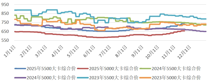 港口市场方面,本周港口市场呈现“价格弱稳,成交僵持,库存高企”特征。受大风封航以及铁路调入量维持高位的共同影响,港口库存持续快速上升。市场对短期走势判断出现分歧,观望情绪浓厚,部分贸易商因发运成本高和冬季预期报价坚挺;另一部分则因高库存和出货压力,报价出现松动。主流报价保持稳定,但终端对高价接受度低,采购以长协煤为主,买卖双方心理价差较大,现货实际成交量较少,呈现“有价少市”局面。综合来看,当前港口市场正处于“弱平衡”状态,高库存和弱需求压制了价格的上涨空间,但成本支撑和供暖季高需求的预期又限制了价格的下跌幅度。