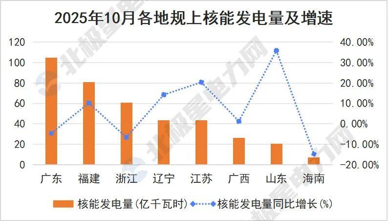 在沿海省份,核电发挥着越来越重要的基荷电源作用,广东、福建、浙江三省核电发电量分别达104.9、80.7和60.7亿千瓦时。