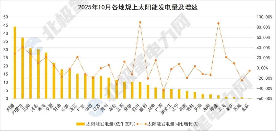 内蒙古与新疆分别在风电与太阳能发电领域领跑,值得注意的是,两地的太阳能发电均增长明显。2025年10月,新疆规上太阳能发电量同比增长28.10%,内蒙古同比增长40.70%。海南省风电增速高达1005.1%,虽然基数较小,但显示出巨大发展潜力。