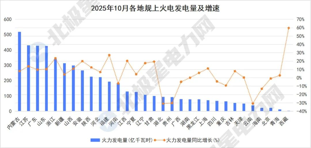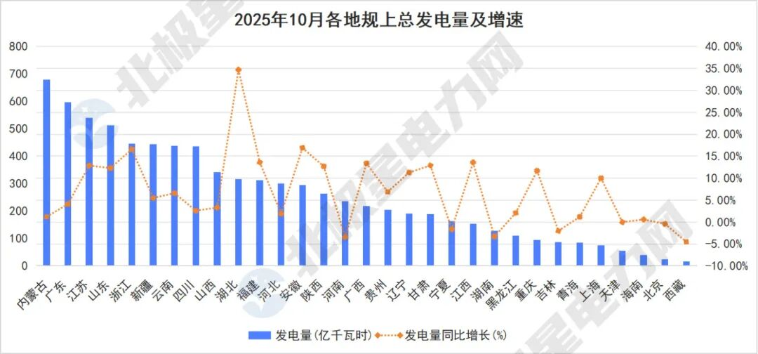 2025年10月,全国全社会用电量增长10.4%。与此同时,时隔多月,全国发电量也再度迎来大涨。据国家统计局消息,2025年10月,全国规上工业发电量8002亿千瓦时,同比增长7.9%;其中,全国规上火电发电量增长7.3%,水电增长28.2%,核电增长4.2%,风电下降11.9%,光伏增长5.9%。