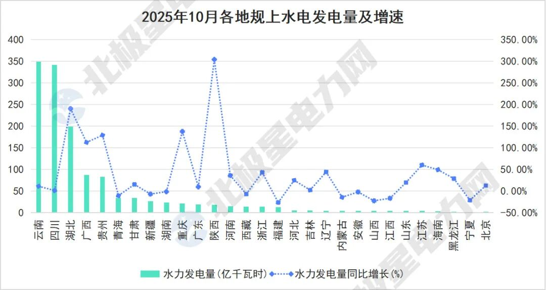 湖北省凭借199.1亿千瓦时的水电量和190.8%的惊人增速,带动全省总发电量飙升34.7%,增速领跑全国。广西、贵州两省区水电增速分别达112.9%和129.3%,重庆、陕西也取得了138%和304.4%的高增长。