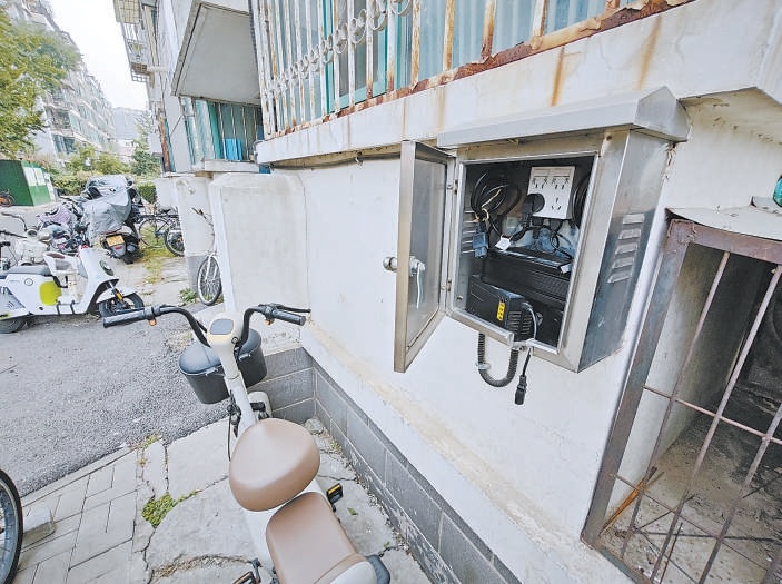 果园西小区有居民在单元门外自行安装了“飞线充电箱”。