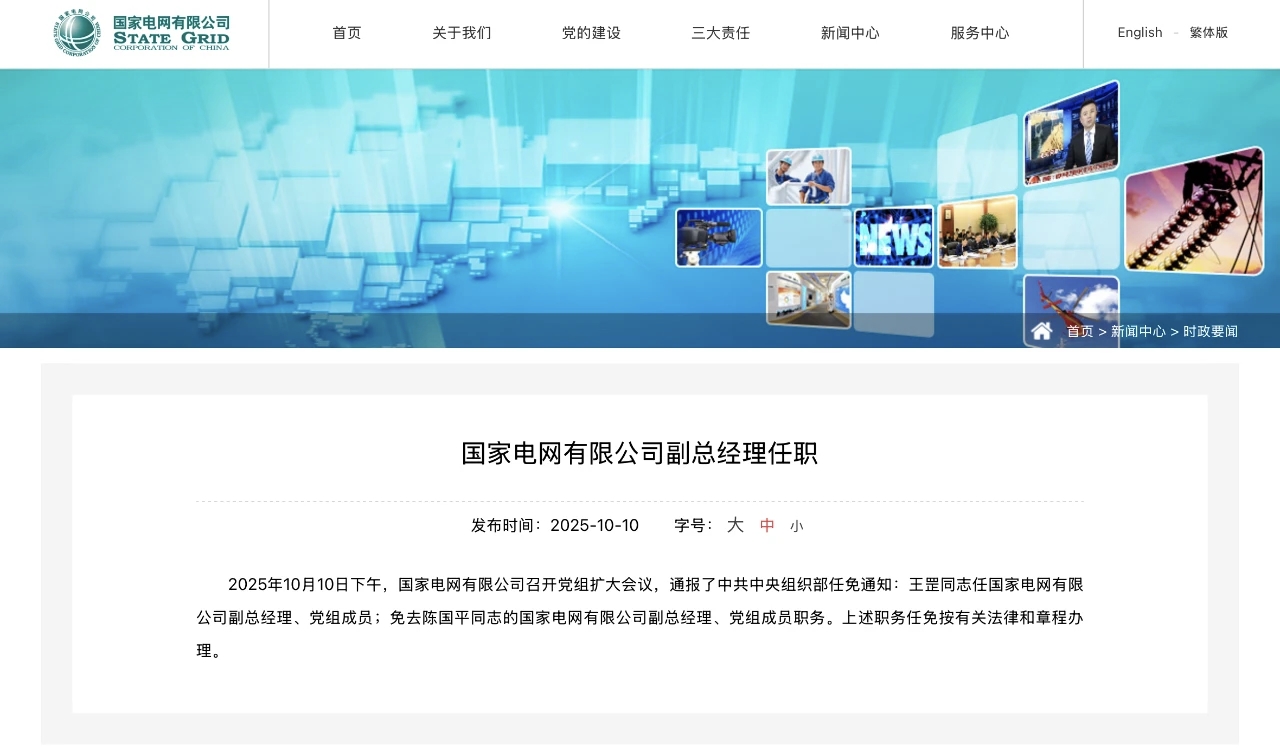 2025年10月10日下午,国家电网有限公司召开党组扩大会议,通报了中共中央组织部有关任免通知:王罡同志任国家电网有限公司副总经理、党组成员;免去陈国平同志的国家电网有限公司副总经理、党组成员职务。上述职务任免将按有关法律和章程办理。