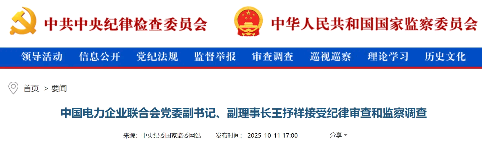中央纪委国家监委网站10月11日消息,据中央纪委国家监委驻中央社会工作部纪检监察组、黑龙江省纪委监委消息:中国电力企业联合会党委副书记、副理事长王抒祥涉嫌严重违纪违法,目前正接受中央纪委国家监委驻中央社会工作部纪检监察组纪律审查和黑龙江省牡丹江市监察委员会监察调查。(中央纪委国家监委驻中央社会工作部纪检监察组、黑龙江省纪委监委)