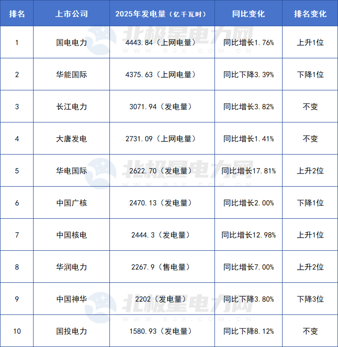 洗牌!五大六小“旗舰”上市公司发电量TOP10