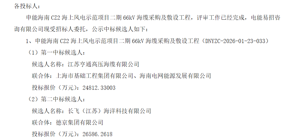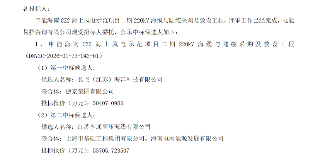 3月4日,申能海南CZ2海上风电示范项目二期220kV海缆与陆缆采购及敷设工程、66kV海缆采购及敷设工程中标候选人公示。