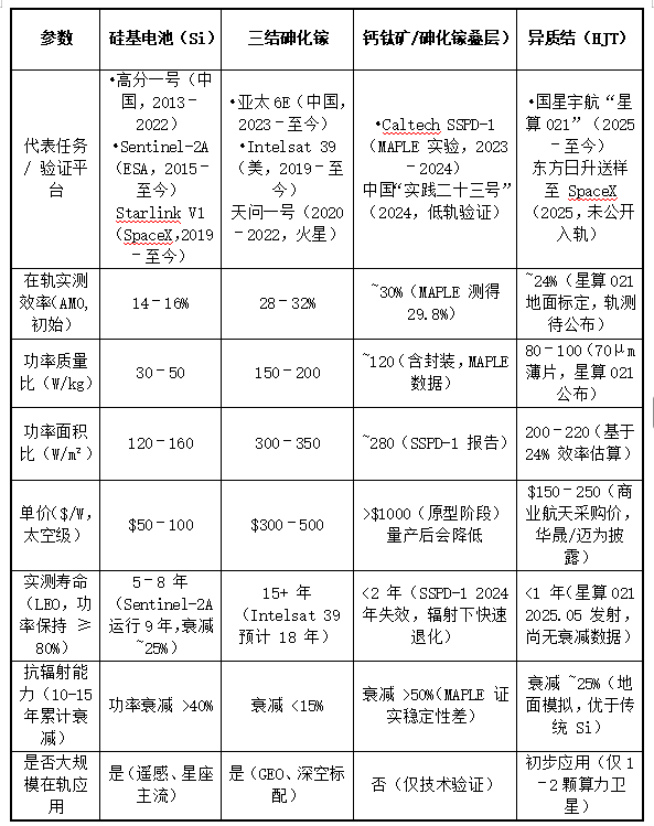 以下列举硅电池、砷化镓电池、异质结(HTJ)电池和钙钛矿电池的数据对比,以供参考了解太空电池技术的水平情况。