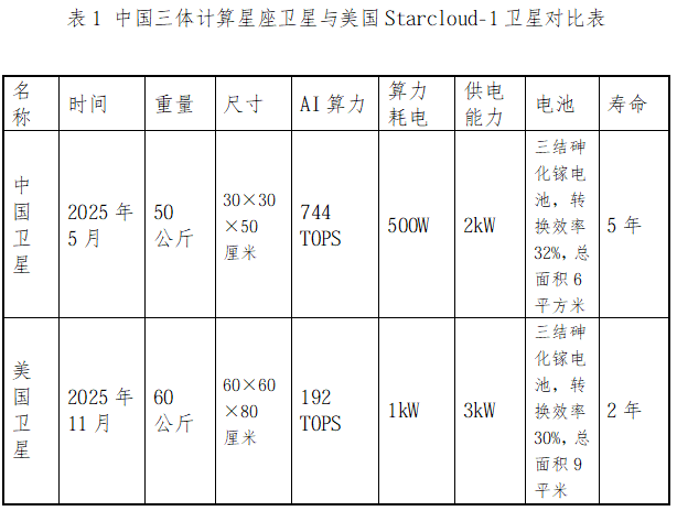 从算力和电力两个角度来说,目前单颗AI算力卫星的算力水平在几百TOPS水平,电力供应在几个kW水平,算力耗电在几百W水平,卫星重量在几十公斤水平,以下例举了目前最先进的算力卫星数据对比。