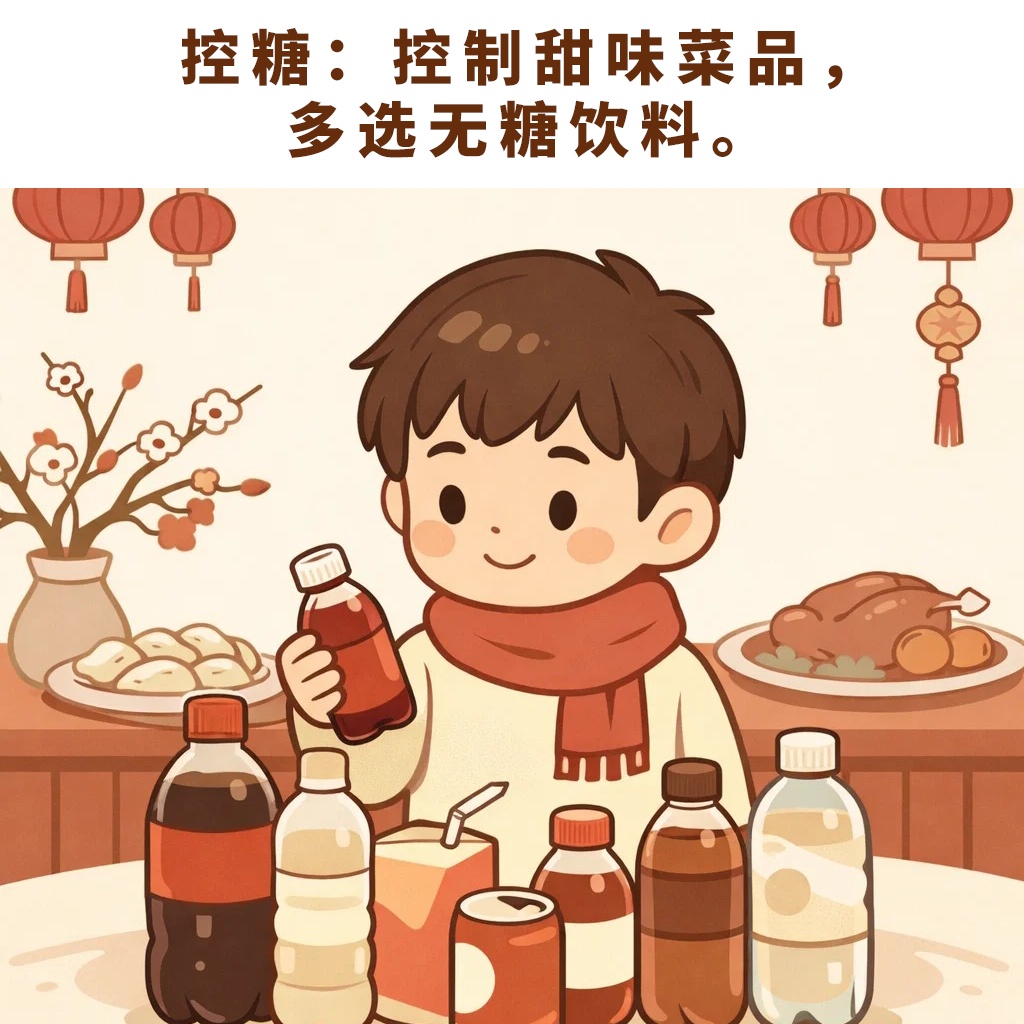 一是控制糖醋排骨、松鼠桂鱼、红烧肉、拔丝地瓜等糖较多的菜肴数量。二是选择牛奶、酸奶、无糖饮料和纯茶饮佐餐,减少含糖饮料、果汁、乳酸菌饮料等含糖较多的饮品。