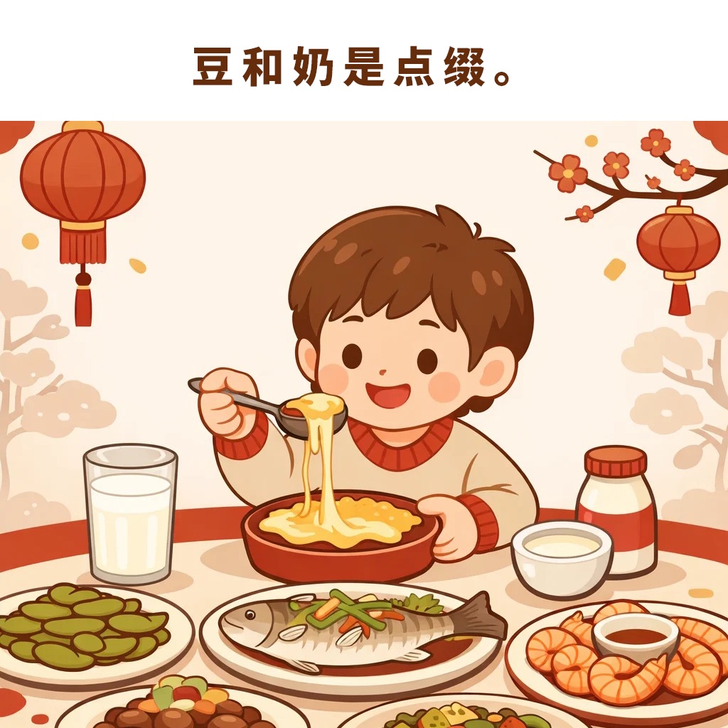 多数人日常奶制品和豆制品摄入不足,因此建议每餐都要至少安排一个豆类菜品,比如豆腐、香干、千张(干豆腐)、毛豆等。牛奶或酸奶都可以作为佐餐的饮品,有一些菜品使用芝士也是很不错的选择,但不要把乳饮料当成奶喝。