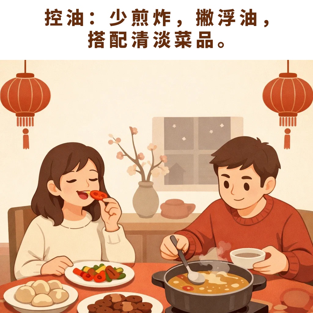 尽管大家日常并不缺“油水”,但春节宴席鸡鸭鱼肉依然是餐桌上的主角。建议优先选择清蒸鱼、白灼虾、水蒸蛋、瘦肉等低脂且优质蛋白丰富的食物,红烧肉、肘子、手抓羊肉、肥牛等较油腻的荤菜最好和清淡少油的蔬菜搭配。