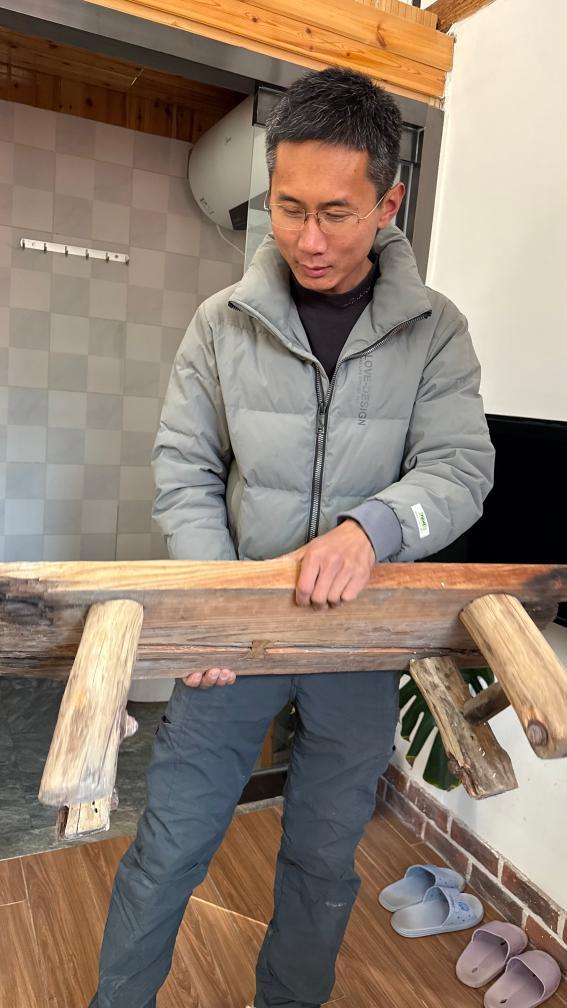 于海洋在其改造的传统海草房民宿中向记者展示其手工制作的家具。新华社记者 李志浩 摄