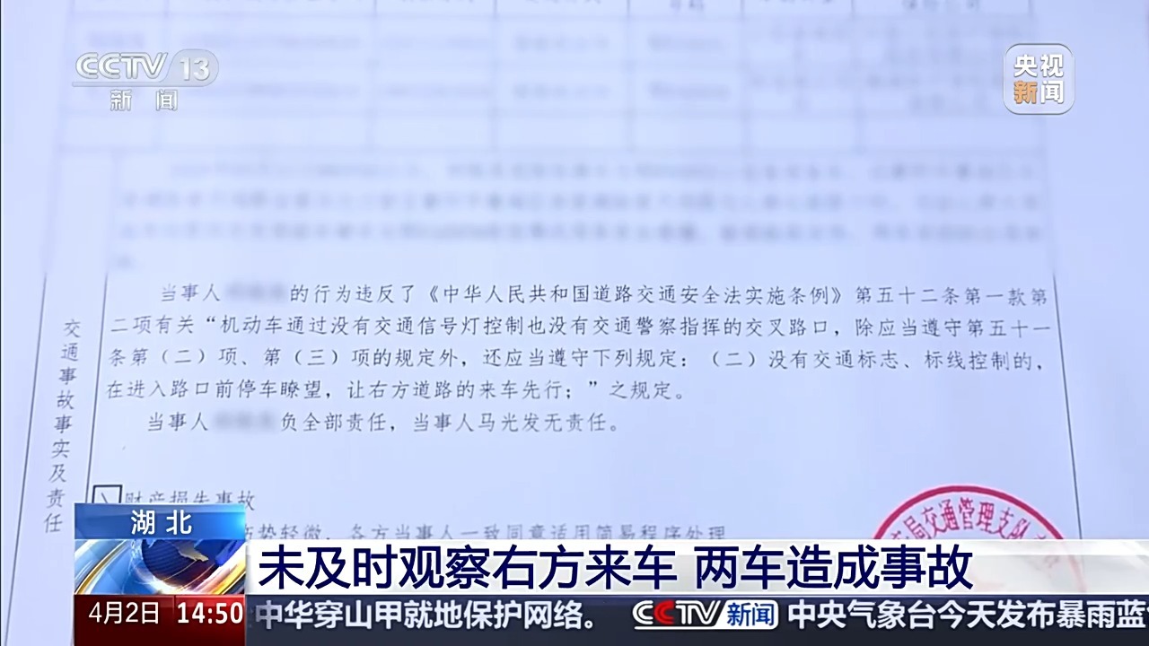襄阳市公安局交通管理支队交警一大队民警 肖龙:白色小车沿路口由南向北行驶时,没有及时注意观察到右方的小货车。两辆车行驶至路口时,等白色小车发现时已来不及刹车,最终,两车在交叉口中心位置发生了碰撞。
