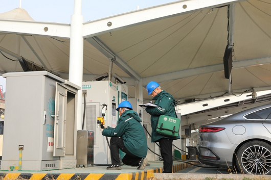 国网山东菏泽供电公司员工在高速服务区充电站检查充电设施运行状态。