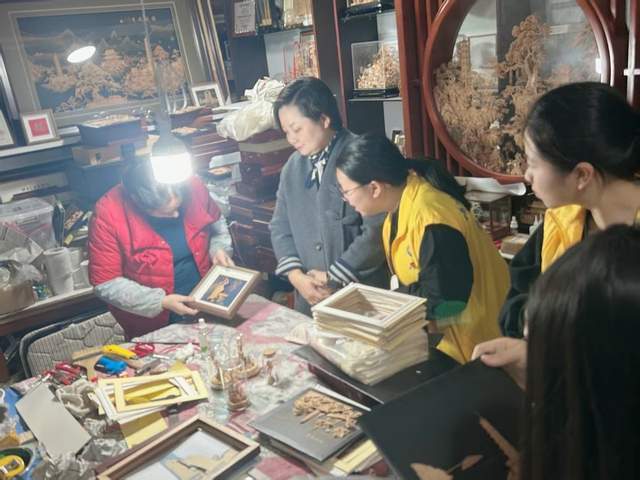 立足金融专业核心优势,实践队从“文化感知”稳步走向“问题探究”,坚持问题导向开展全方位、多层次实地调研,精准把脉不同传承场景下闽都非遗的发展现状与核心诉求。队员们深入访谈吴航喜箩、软木画、茉莉花茶等非遗项目传承人及运营管理者,细致梳理小微非遗工坊在人才培育、原料采购、产品研发、资金周转等方面面临的现实困境,以及规模化非遗生产基地在成本管控、市场拓展、品牌打造等方面的发展瓶颈;实地走访福州非遗展示馆、上下杭历史文化街区,亲身体验数字化展陈技术,系统调研非遗商户的运营模式与发展痛点,深入分析文旅融合背景下非遗业态数字化转型、市场化运营的短板与不足;走进西园中心小学,实地察看软木画进校园的推进情况,与小学授课教师深入交流,详细掌握非遗校园传承在课程设计、师资培养、教具采购等方面的实际需求,全方位、多维度摸清闽都非遗传承的痛点难点与发展期盼,为后续精准赋能筑牢基础。
