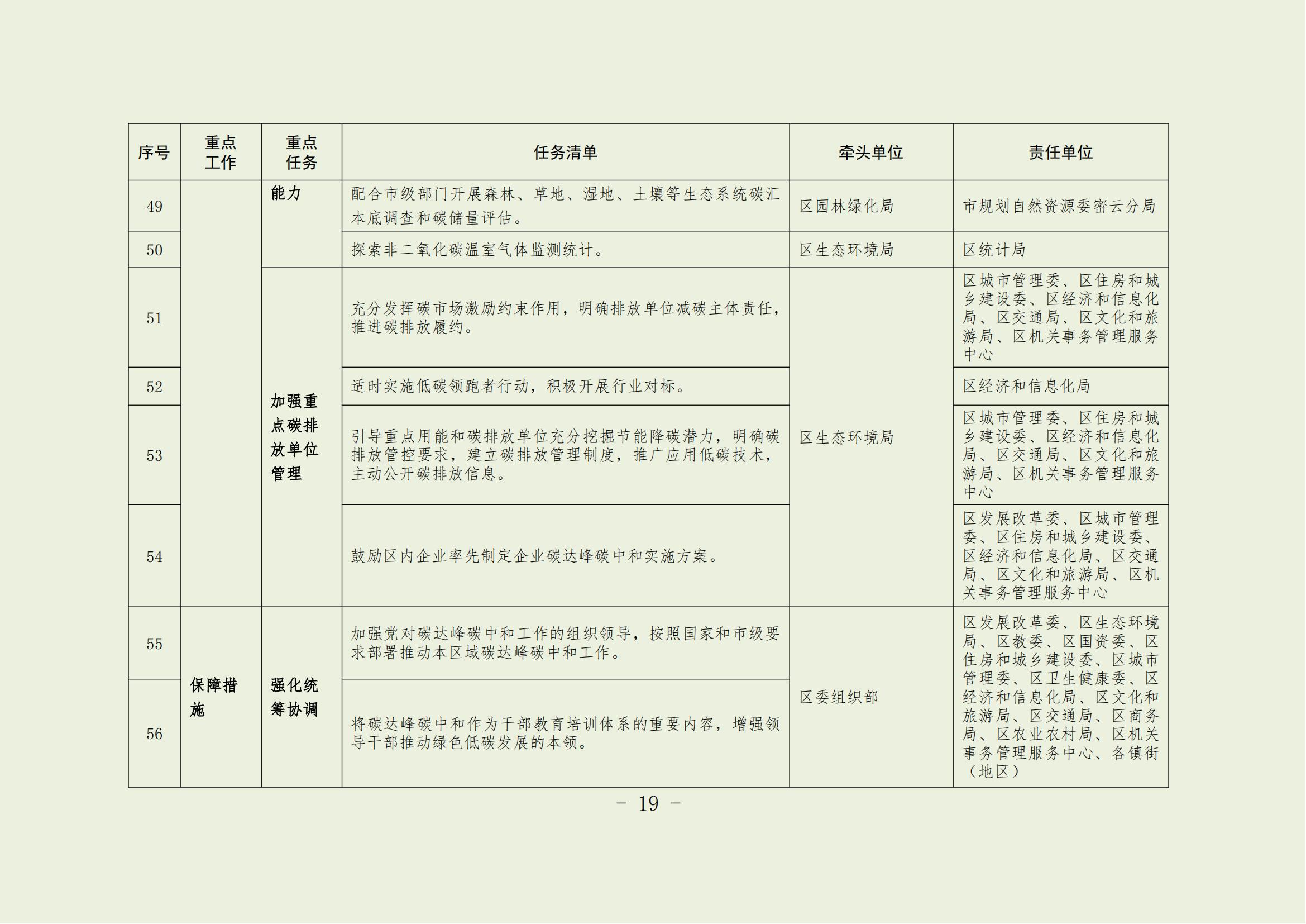 18.压实目标责任。按照国家和本市碳排放双控安排部署,严格落实节能降碳目标责任评价考核任务,科学分配区级考核指标,逐级分解重点单位的跟踪监管任务,研究制定区级工作方案。将碳达峰碳中和相关指标纳入经济社会发展综合评价体系,把碳达峰碳中和建设工作实绩作为干部综合考核的重要内容。