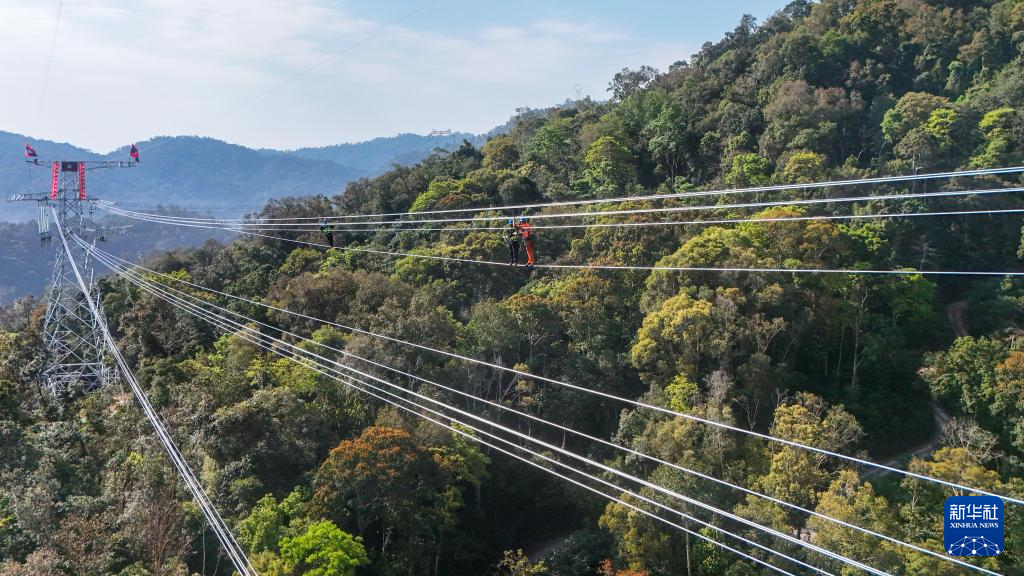 2月5日,施工人员分别从位于中国和老挝境内的铁塔相向出发,前往线路连接点汇合(无人机照片)。新华社记者 彭奕凯 摄