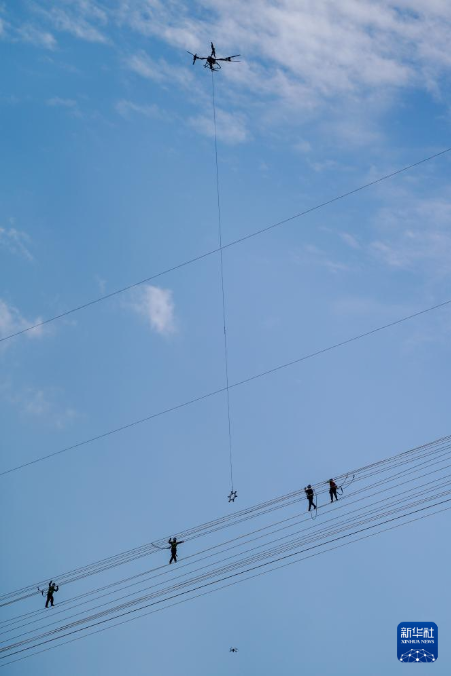 2月5日,工人使用无人机吊运辅助连通作业。新华社记者 彭奕凯 摄