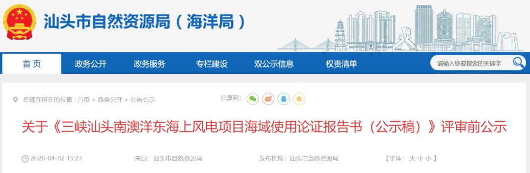 4月2日,汕头市自然资源局发布关于《三峡汕头南澳洋东海上风电项目海域使用论证报告书(公示稿)》评审前公示。