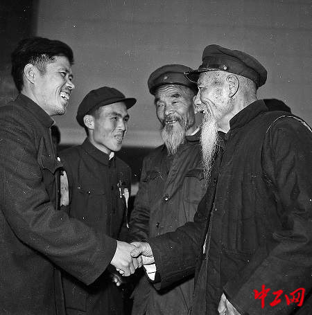1959年10月,北京,全国工业群英会铁道系统代表和长辛店“二七”老工人亲切交谈。