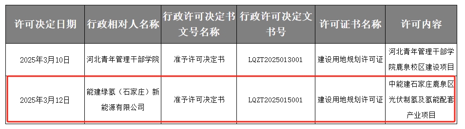 据悉,2023年7月,中国能源建设集团北方建设投资有限公司投资石家庄市鹿泉区中能建石家庄鹿泉区光伏制氢及氢能配套产业项目,计划总投资31.87亿元。2024年7月,该项目详细规划出炉,2025年3月12日,该规划项目获建设用地规划许可证。