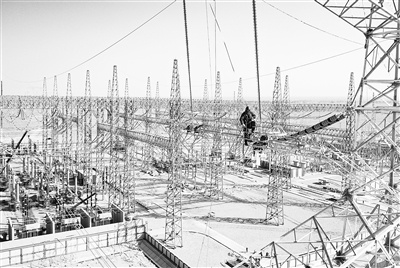 工人在新疆环塔里木盆地750千伏输变电工程进行高空作业。新华社记者 陈朔 摄
