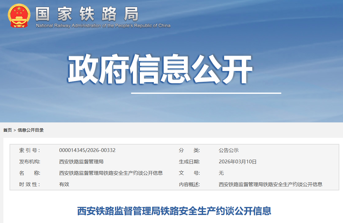 3月10日,国家铁路局公示西安铁路监督管理局铁路安全生产约谈公开信息。